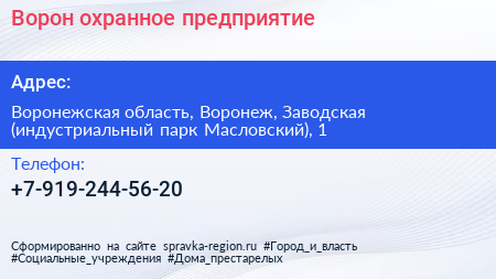 Ворон, охранное предприятие по адресу Воронежская область, Воронеж, Заводская (индустриальный парк Масловский), 1 в дальнейшем Организация, размещена в следующих категориях: