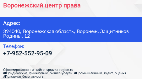 Воронежский центр права по адресу 394040, Воронежская область, Воронеж, Защитников Родины, 12 в дальнейшем Организация, размещена в следующих категориях: