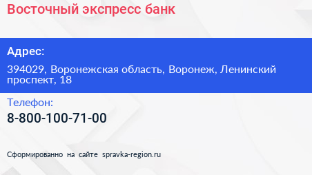 Восточный экспресс банк по адресу 394029, Воронежская область, Воронеж, Ленинский проспект, 18 в дальнейшем Организация, размещена в следующих категориях: