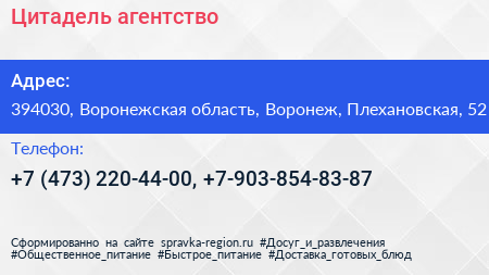 Цитадель, агентство по адресу 394030, Воронежская область, Воронеж, Плехановская, 52 в дальнейшем Организация, размещена в следующих категориях: