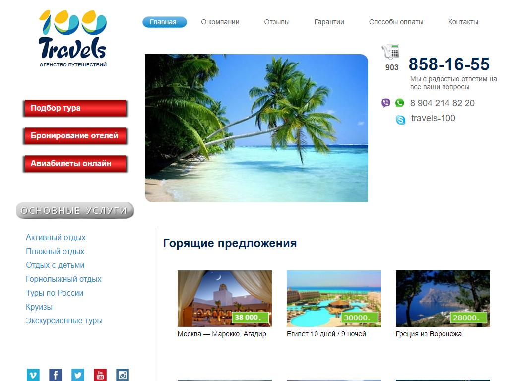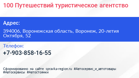 100 Путешествий, туристическое агентство по адресу 394006, Воронежская область, Воронеж, 20-летия Октября, 52 в дальнейшем Организация, размещена в следующих категориях: