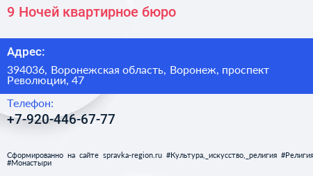 9 Ночей, квартирное бюро по адресу 394036, Воронежская область, Воронеж, проспект Революции, 47 в дальнейшем Организация, размещена в следующих категориях: