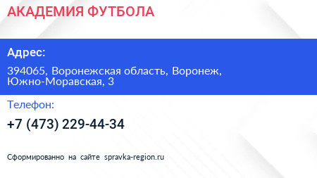 АКАДЕМИЯ ФУТБОЛА по адресу 394065, Воронежская область, Воронеж, Южно-Моравская, 3 в дальнейшем Организация, размещена в следующих категориях: