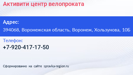 Активити, центр велопроката по адресу 394068, Воронежская область, Воронеж, Хользунова, 10Б в дальнейшем Организация, размещена в следующих категориях: