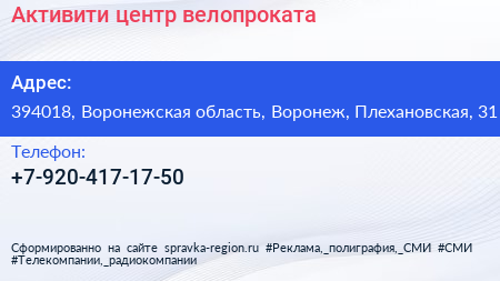Активити, центр велопроката по адресу 394018, Воронежская область, Воронеж, Плехановская, 31 в дальнейшем Организация, размещена в следующих категориях: