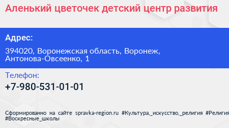 Аленький цветочек, детский центр развития по адресу 394020, Воронежская область, Воронеж, Антонова-Овсеенко, 1 в дальнейшем Организация, размещена в следующих категориях: