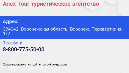 Anex Tour, туристическое агентство по адресу 394042, Воронежская область, Воронеж, Перевёрткина, 1/2 в дальнейшем Организация, размещена в следующих категориях: