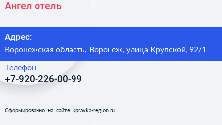 Ангел, отель по адресу Воронежская область, Воронеж, улица Крупской, 92/1 в дальнейшем Организация, размещена в следующих категориях: