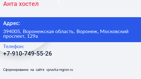 Анта, хостел по адресу 394005, Воронежская область, Воронеж, Московский проспект, 129а в дальнейшем Организация, размещена в следующих категориях: