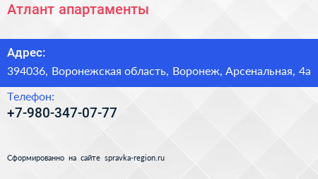 Атлант, апартаменты по адресу 394036, Воронежская область, Воронеж, Арсенальная, 4а в дальнейшем Организация, размещена в следующих категориях: