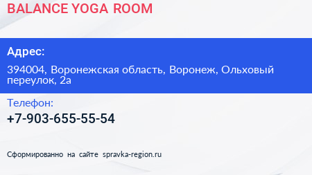 BALANCE YOGA ROOM по адресу 394004, Воронежская область, Воронеж, Ольховый переулок, 2а в дальнейшем Организация, размещена в следующих категориях: