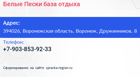 Белые Пески, база отдыха по адресу 394026, Воронежская область, Воронеж, Дружинников, 8 в дальнейшем Организация, размещена в следующих категориях:
