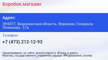 Боробок, магазин по адресу 394077, Воронежская область, Воронеж, Генерала Лизюкова, 17а в дальнейшем Организация, размещена в следующих категориях: