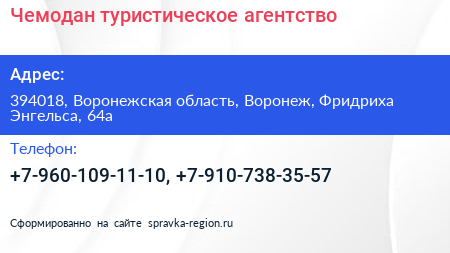 Чемодан, туристическое агентство по адресу 394018, Воронежская область, Воронеж, Фридриха Энгельса, 64а в дальнейшем Организация, размещена в следующих категориях: