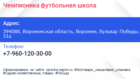 Чемпионика, футбольная школа по адресу 394088, Воронежская область, Воронеж, бульвар Победы, 51а в дальнейшем Организация, размещена в следующих категориях:
