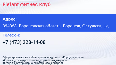 Elefant, фитнес-клуб по адресу 394063, Воронежская область, Воронеж, Остужева, 1д в дальнейшем Организация, размещена в следующих категориях: