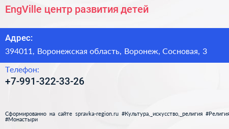 EngVille, центр развития детей по адресу 394011, Воронежская область, Воронеж, Сосновая, 3 в дальнейшем Организация, размещена в следующих категориях: