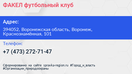 ФАКЕЛ, футбольный клуб по адресу 394052, Воронежская область, Воронеж, Краснознамённая, 101 в дальнейшем Организация, размещена в следующих категориях: