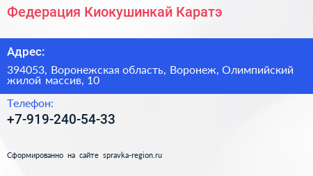 Федерация Киокушинкай Каратэ по адресу 394053, Воронежская область, Воронеж, Олимпийский жилой массив, 10 в дальнейшем Организация, размещена в следующих категориях: