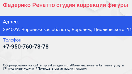 Федерико & Ренатто, студия коррекции фигуры по адресу 394029, Воронежская область, Воронеж, Циолковского, 11 в дальнейшем Организация, размещена в следующих категориях: