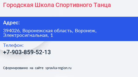 Городская Школа Спортивного Танца по адресу 394026, Воронежская область, Воронеж, Электросигнальная, 1 в дальнейшем Организация, размещена в следующих категориях: