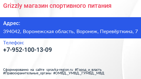 Grizzly, магазин спортивного питания по адресу 394042, Воронежская область, Воронеж, Перевёрткина, 7 в дальнейшем Организация, размещена в следующих категориях: