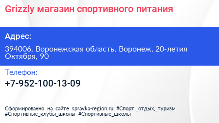 Grizzly, магазин спортивного питания по адресу 394006, Воронежская область, Воронеж, 20-летия Октября, 90 в дальнейшем Организация, размещена в следующих категориях: