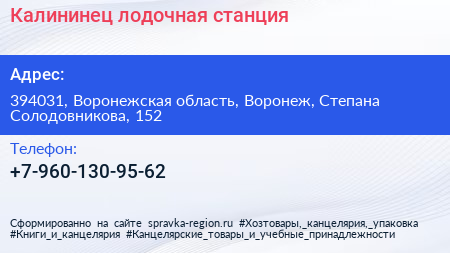 Калининец, лодочная станция по адресу 394031, Воронежская область, Воронеж, Степана Солодовникова, 152 в дальнейшем Организация, размещена в следующих категориях: