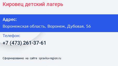 Кировец, детский лагерь по адресу Воронежская область, Воронеж, Дубовая, 56 в дальнейшем Организация, размещена в следующих категориях: