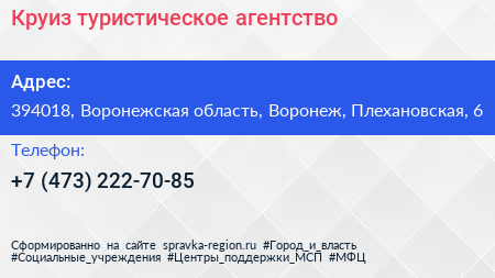 Круиз, туристическое агентство по адресу 394018, Воронежская область, Воронеж, Плехановская, 6 в дальнейшем Организация, размещена в следующих категориях:
