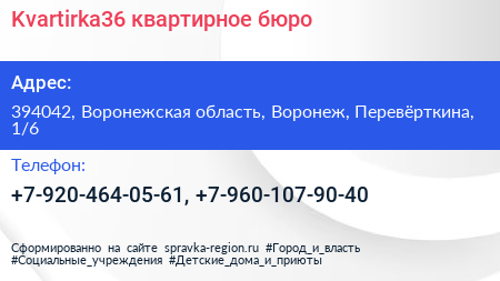 Kvartirka36, квартирное бюро по адресу 394042, Воронежская область, Воронеж, Перевёрткина, 1/6 в дальнейшем Организация, размещена в следующих категориях: