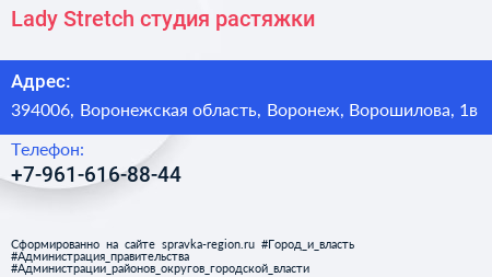 Lady Stretch, студия растяжки по адресу 394006, Воронежская область, Воронеж, Ворошилова, 1в в дальнейшем Организация, размещена в следующих категориях: