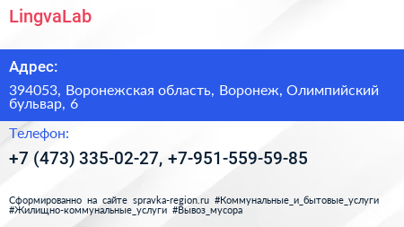 LingvaLab по адресу 394053, Воронежская область, Воронеж, Олимпийский бульвар, 6 в дальнейшем Организация, размещена в следующих категориях: