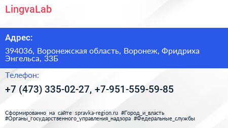 LingvaLab по адресу 394036, Воронежская область, Воронеж, Фридриха Энгельса, 33Б в дальнейшем Организация, размещена в следующих категориях: