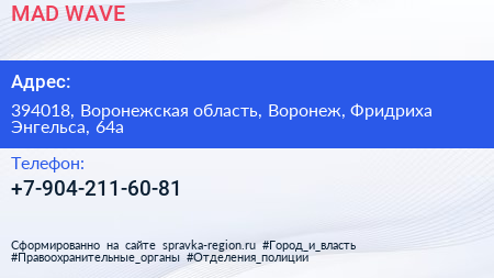MAD WAVE по адресу 394018, Воронежская область, Воронеж, Фридриха Энгельса, 64а в дальнейшем Организация, размещена в следующих категориях: