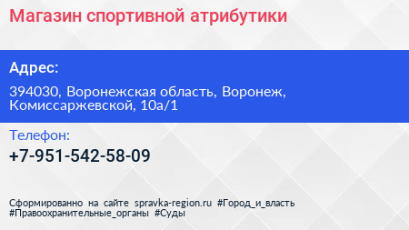 Магазин спортивной атрибутики по адресу 394030, Воронежская область, Воронеж, Комиссаржевской, 10а/1 в дальнейшем Организация, размещена в следующих категориях: