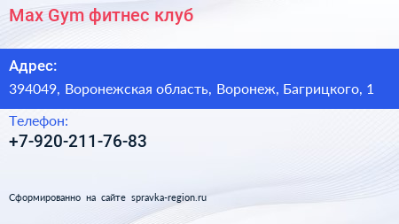 Max Gym, фитнес-клуб по адресу 394049, Воронежская область, Воронеж, Багрицкого, 1 в дальнейшем Организация, размещена в следующих категориях: