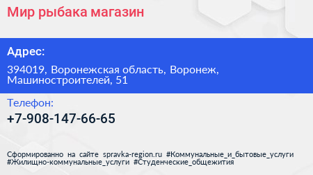 Мир рыбака, магазин по адресу 394019, Воронежская область, Воронеж, Машиностроителей, 51 в дальнейшем Организация, размещена в следующих категориях: