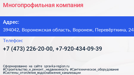 Многопрофильная компания по адресу 394042, Воронежская область, Воронеж, Перевёрткина, 24 в дальнейшем Организация, размещена в следующих категориях: