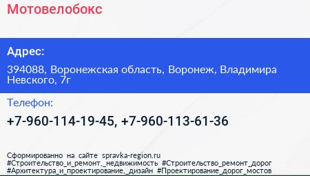 Мотовелобокс по адресу 394088, Воронежская область, Воронеж, Владимира Невского, 7г в дальнейшем Организация, размещена в следующих категориях: