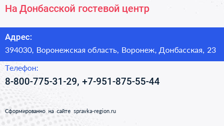 На Донбасской, гостевой центр по адресу 394030, Воронежская область, Воронеж, Донбасская, 23 в дальнейшем Организация, размещена в следующих категориях: