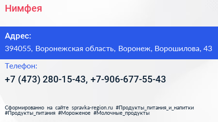 Нимфея по адресу 394055, Воронежская область, Воронеж, Ворошилова, 43 в дальнейшем Организация, размещена в следующих категориях: