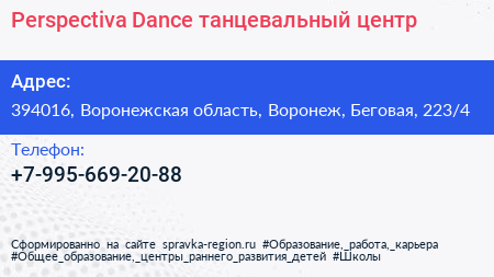 Perspectiva Dance, танцевальный центр по адресу 394016, Воронежская область, Воронеж, Беговая, 223/4 в дальнейшем Организация, размещена в следующих категориях: