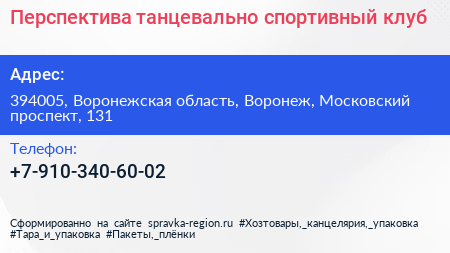 Перспектива, танцевально-спортивный клуб по адресу 394005, Воронежская область, Воронеж, Московский проспект, 131 в дальнейшем Организация, размещена в следующих категориях: