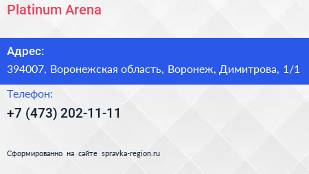 Platinum Arena по адресу 394007, Воронежская область, Воронеж, Димитрова, 1/1 в дальнейшем Организация, размещена в следующих категориях: