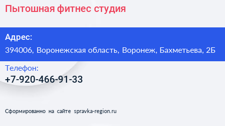 Пытошная, фитнес-студия по адресу 394006, Воронежская область, Воронеж, Бахметьева, 2Б в дальнейшем Организация, размещена в следующих категориях:
