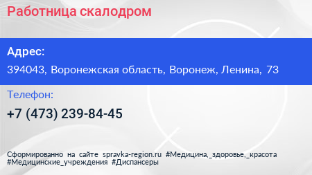 Работница, скалодром по адресу 394043, Воронежская область, Воронеж, Ленина, 73 в дальнейшем Организация, размещена в следующих категориях: