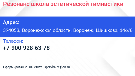 Резонанс, школа эстетической гимнастики по адресу 394053, Воронежская область, Воронеж, Шишкова, 146/8 в дальнейшем Организация, размещена в следующих категориях: