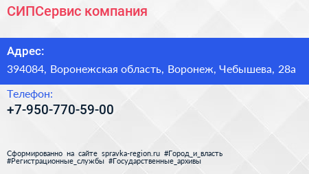 СИПСервис, компания по адресу 394084, Воронежская область, Воронеж, Чебышева, 28а в дальнейшем Организация, размещена в следующих категориях: