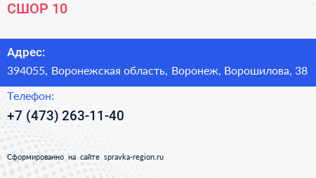 СШОР №10 по адресу 394055, Воронежская область, Воронеж, Ворошилова, 38 в дальнейшем Организация, размещена в следующих категориях: